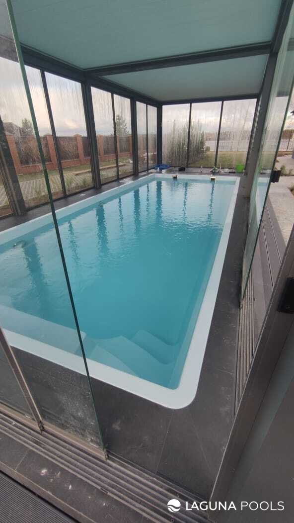 Прямоугольный композитный бассейн с белой чашей и прозрачными стеклянными стенами павильона.