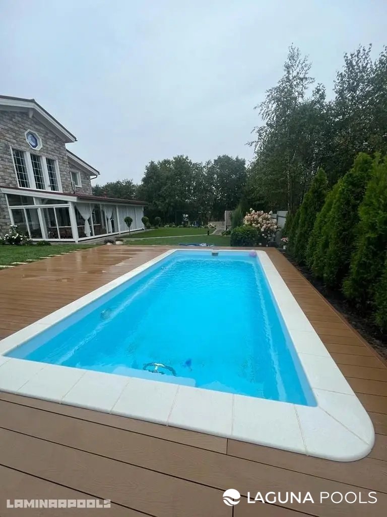 Прямоугольный композитный бассейн с белым бортиком и коричневой террасой на фоне каменного дома и зелени.